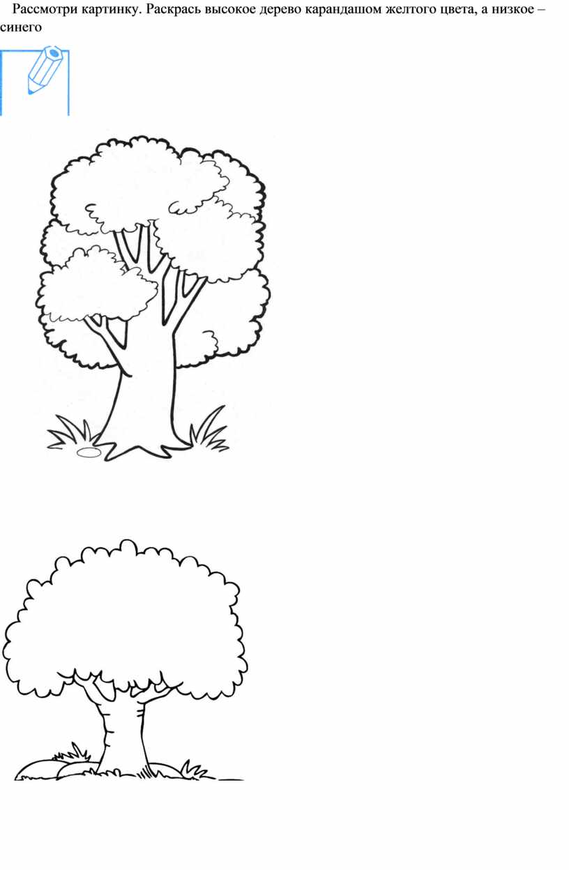 Рассмотри картинку. Раскрась высокое дерево карандашом желтого цвета, а низкое – синего