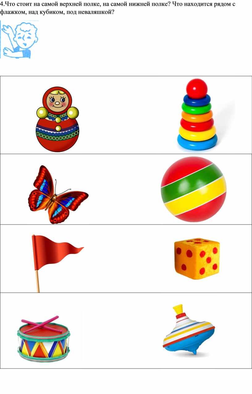 4.Что стоит на самой верхней полке, на самой нижней полке? Что находится рядом с флажком, над кубиком, под неваляшкой?