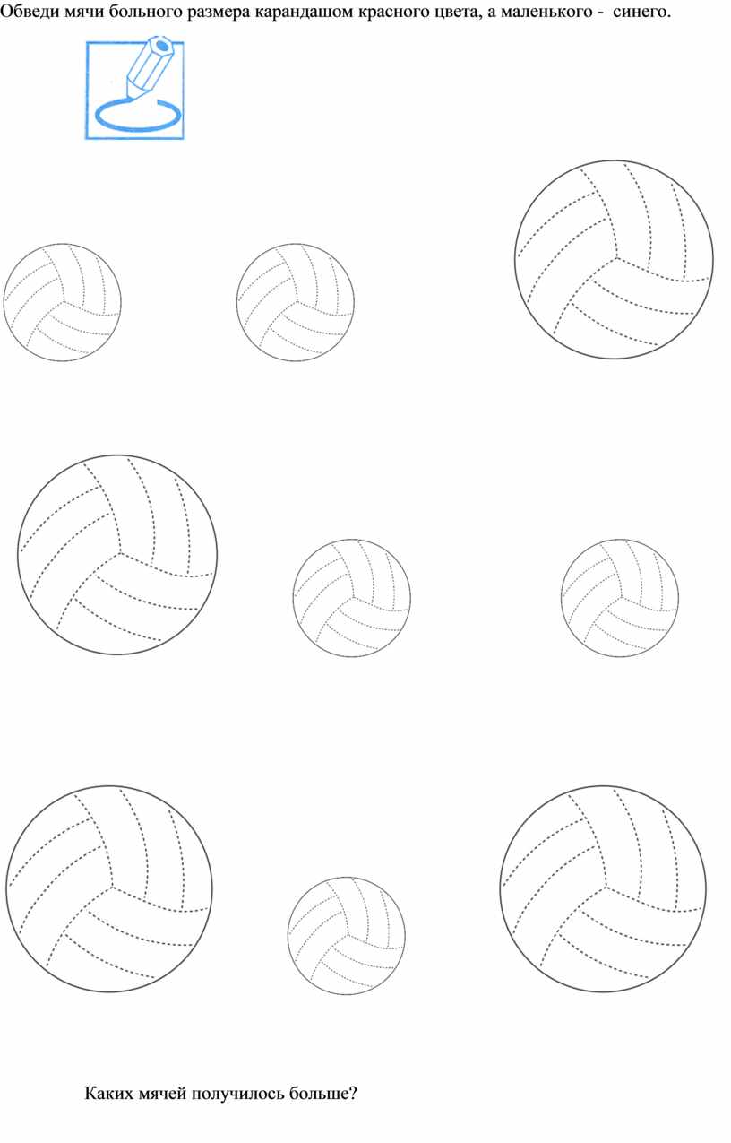 Обведи мячи больного размера карандашом красного цвета, а маленького - синего.