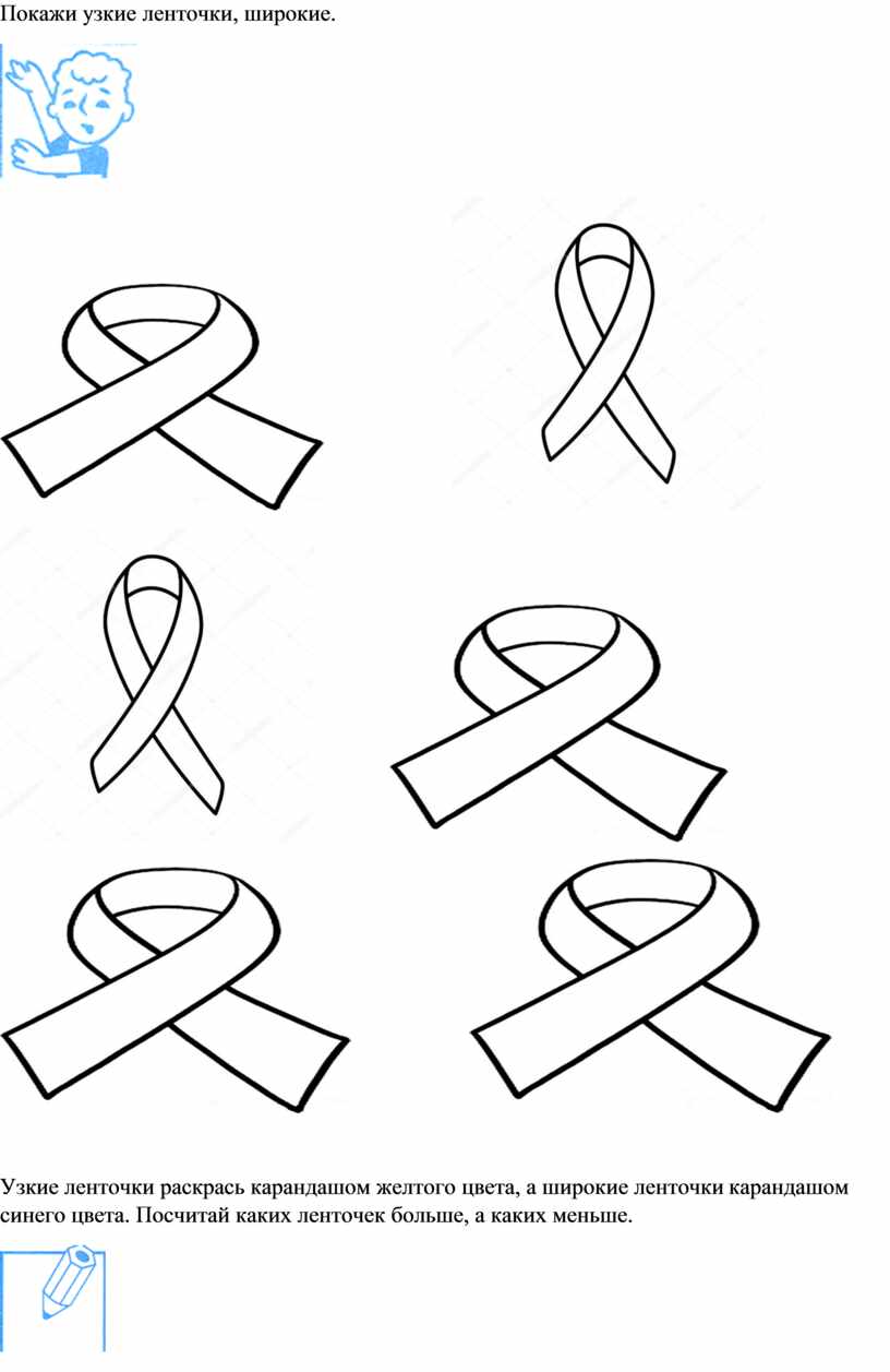 Узкие ленточки раскрась карандашом желтого цвета, а широкие ленточки карандашом синего цвета. Посчитай каких ленточек больше, а каких меньше.