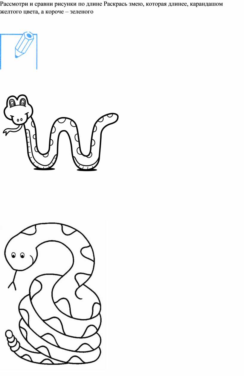 Рассмотри и сравни рисунки по длине Раскрась змею, которая длинее, карандашом желтого цвета, а короче – зеленого