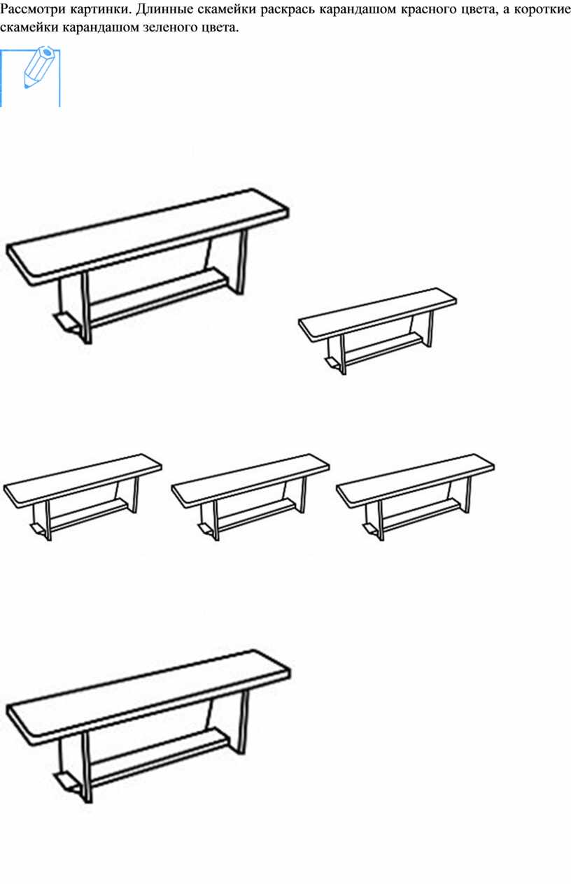 Рассмотри картинки. Длинные скамейки раскрась карандашом красного цвета, а короткие скамейки карандашом зеленого цвета.