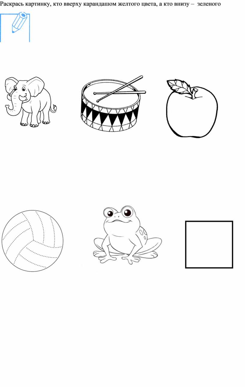 Раскрась картинку, кто вверху карандашом желтого цвета, а кто внизу – зеленого