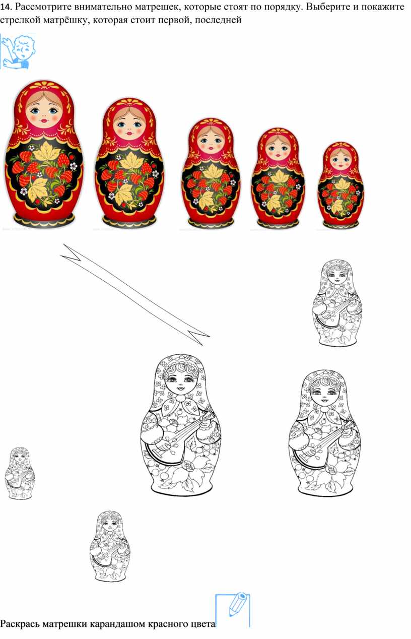14. Рассмотрите внимательно матрешек, которые стоят по порядку. Выберите и покажите стрелкой матрёшку, которая стоит первой, последней