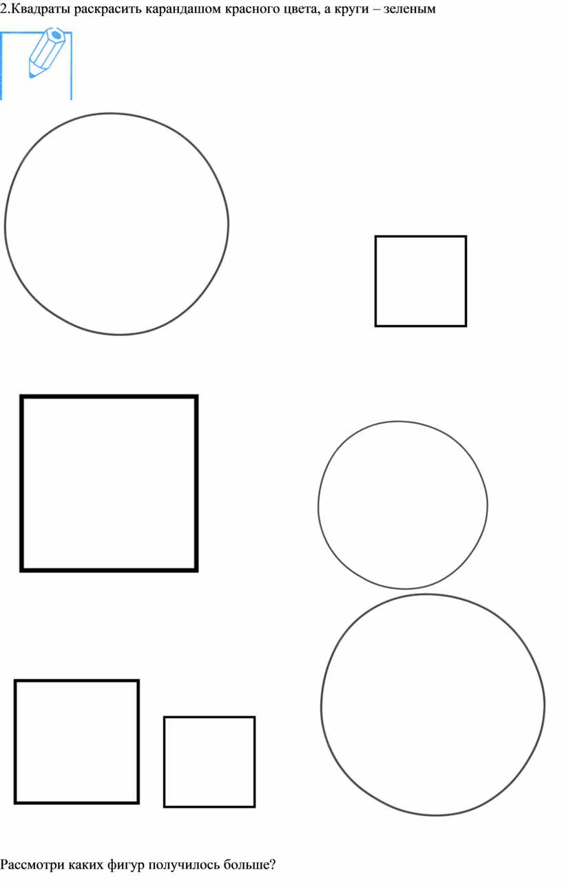 2.Квадраты раскрасить карандашом красного цвета, а круги – зеленым