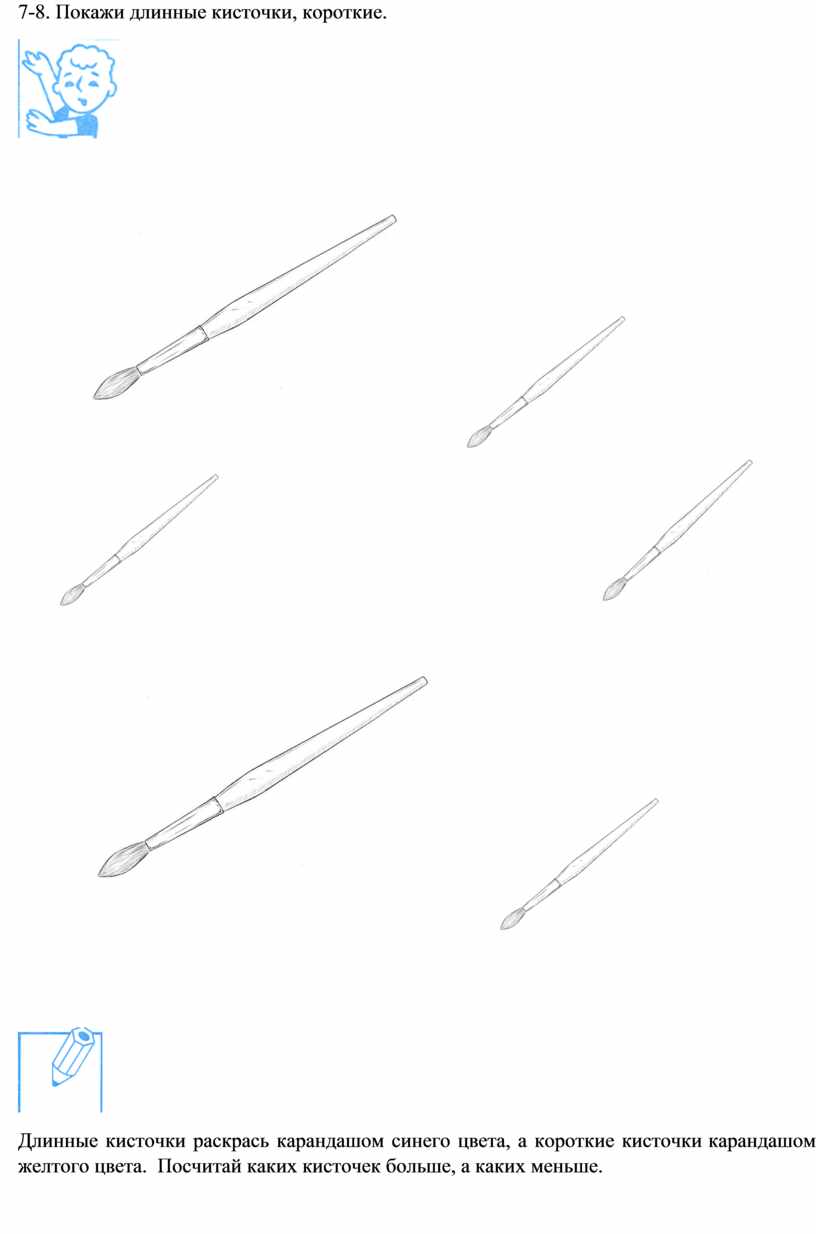 Длинные кисточки раскрась карандашом синего цвета, а короткие кисточки карандашом желтого цвета. Посчитай каких кисточек больше, а каких меньше.