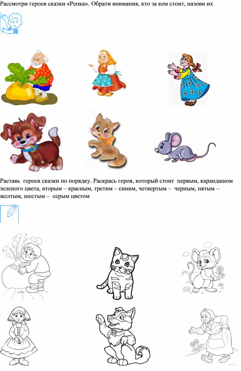 Раставь героев сказки по порядку. Раскрась героя, который стоит первым, карандашом зеленого цвета, вторым – красным, третим – синим, четвертым – черным, пятым – желтым, шестым – серым цветом