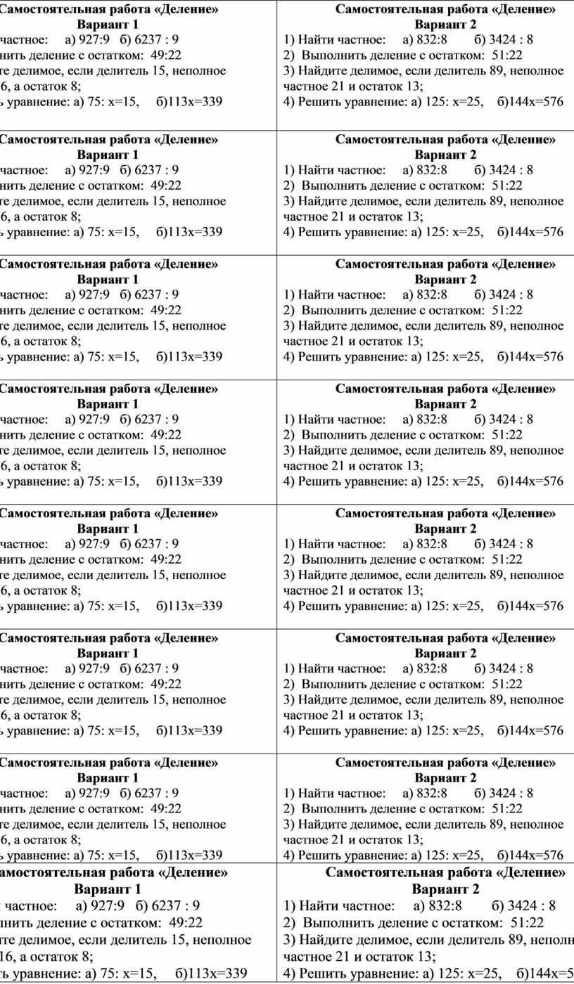 Самостоятельная работа «Деление» Вариант 2 1) Найти частное: а) 832:8 б) 3424 : 8 2) Выполнить деление с остатком: 51:22 3) Найдите делимое, если делитель 89, неполное частное 21 и остаток 13; 4) Решить уравнение: а) 125: х=25, б)144х=576