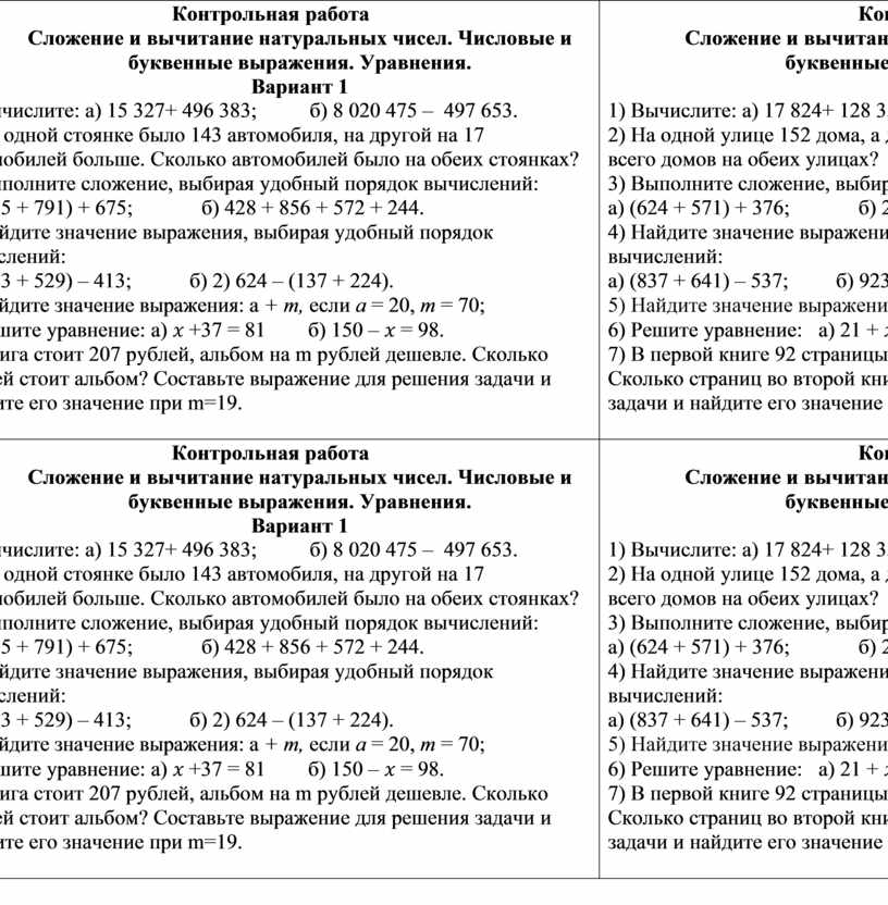 Контрольная работа Сложение и вычитание натуральных чисел. Числовые и буквенные выражения. Уравнения. Вариант 1 1) Вычислите: а) 15 327+ 496 383; б) 8 020 475 – 497 653. 2) На одной стоянке было 143 автомобиля, на другой на 17 автомобилей больше. Сколько автомобилей было на обеих стоянках? 3) Выполните сложение, выбирая удобный порядок вычислений: а) (325 + 791) + 675; б) 428 + 856 + 572 + 244. 4) Найдите значение выражения, выбирая удобный порядок вычислений: а) (713 + 529) – 413; б) 2) 624 – (137 + 224). 5) Найдите значение выражения: а + т, если а = 20, т = 70; 6) Решите уравнение: а) 𝑥 +37 = 81 б) 150 – 𝑥 = 98. 7) Книга стоит 207 рублей, альбом на m рублей дешевле. Сколько рублей стоит альбом? Составьте выражение для решения задачи и найдите его значение при m=19. |