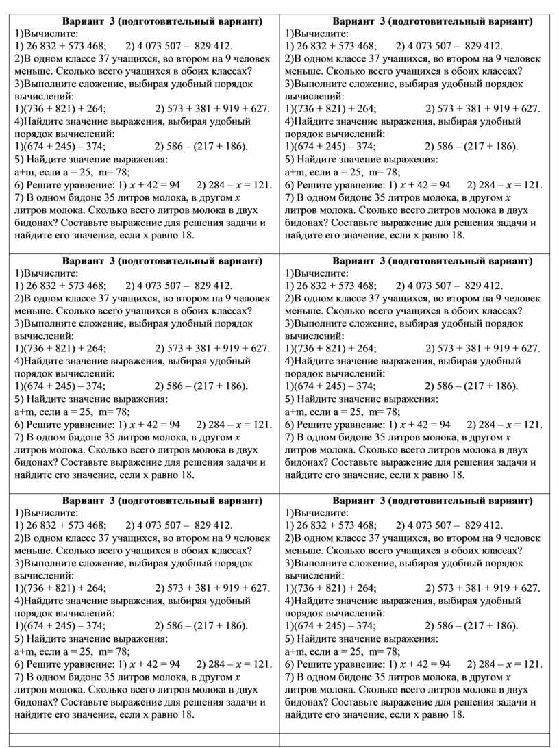 Вариант 3 (подготовительный вариант) 1)Вычислите: 1) 26 832 + 573 468; 2) 4 073 507 – 829 412. 2)В одном классе 37 учащихся, во втором на 9 человек меньше. Сколько всего учащихся в обоих классах? 3)Выполните сложение, выбирая удобный порядок вычислений: 1)(736 + 821) + 264; 2) 573 + 381 + 919 + 627. 4)Найдите значение выражения, выбирая удобный порядок вычислений: 1)(674 + 245) – 374; 2) 586 – (217 + 186). 5) Найдите значение выражения: a+m, если а = 25, m= 78; 6) Решите уравнение: 1) 𝑥 + 42 = 94 2) 284 – 𝑥 = 121. 7) В одном бидоне 35 литров молока, в другом х литров молока. Сколько всего литров молока в двух бидонах? Составьте выражение для решения задачи и найдите его значение, если х равно 18.