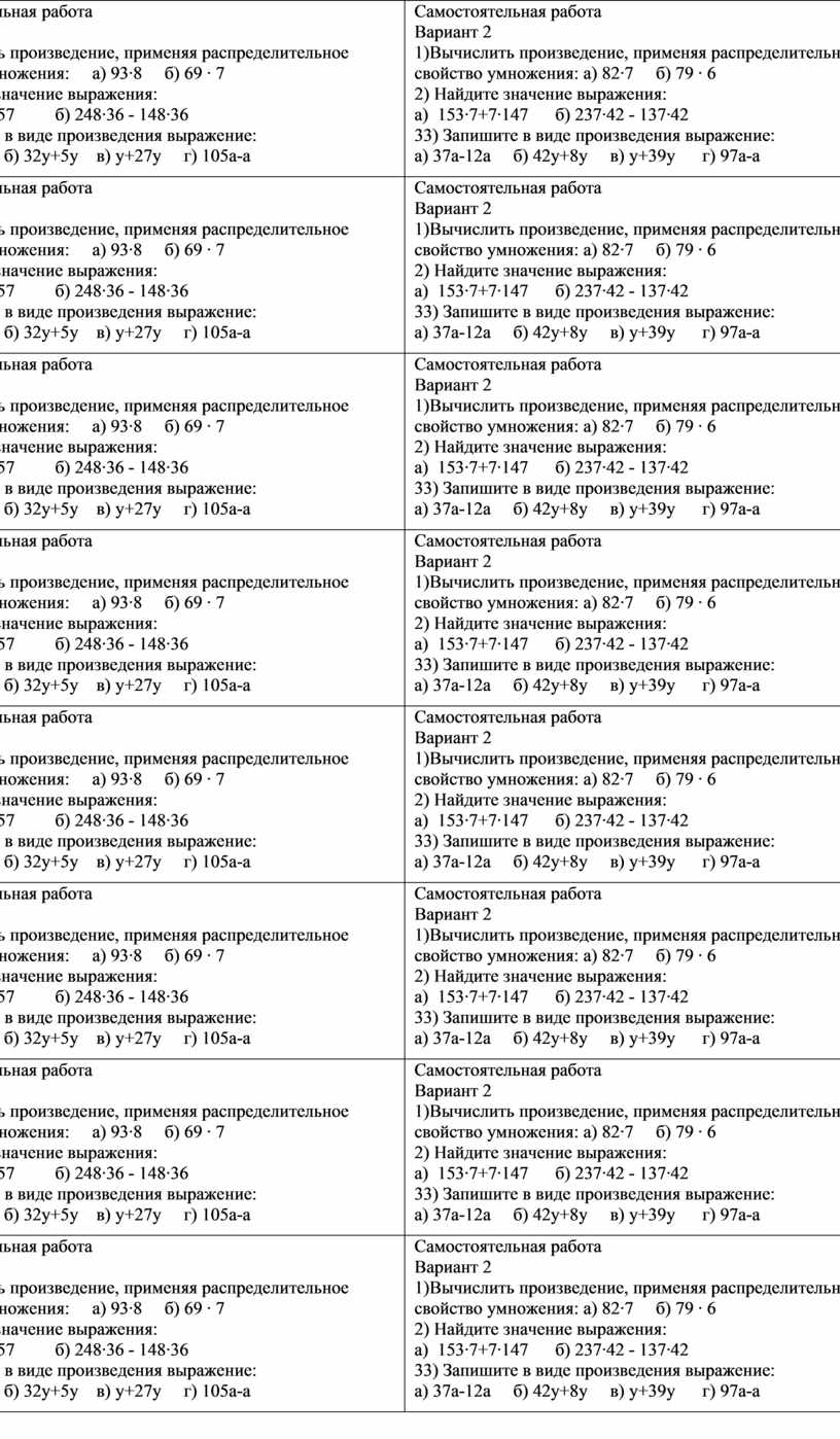 Самостоятельная работа Вариант 1 1)Вычислить произведение, применяя распределительное свойство умножения: а) 93∙8 б) 69 ∙ 7 2) Найдите значение выражения: а) 143∙5+5∙157 б) 248∙36 - 148∙36 3) Запишите в виде произведения выражение: а) 47а-14а б) 32у+5у в) у+27у г) 105а-а