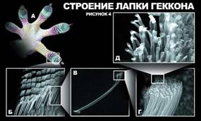 геккона; Б – «подушечка» пальца геккона под микроскопом;