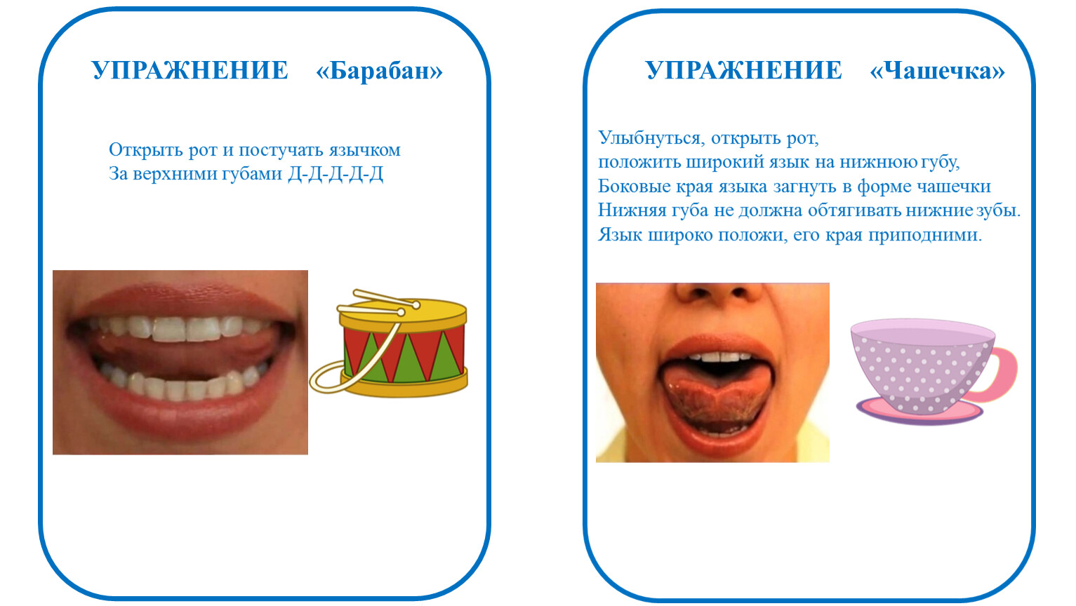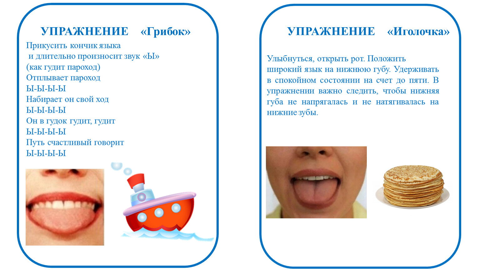 широкий язык на нижнюю губу. Удерживать в спокойном состоянии на счет до пяти. В упражнении важно следить, чтобы нижняя губа не напрягалась и не натягивалась на нижние зубы.