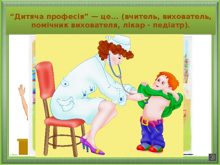 “Дитяча професія” — це... (вчитель, вихователь, помічник вихователя, лікар - педіатр).