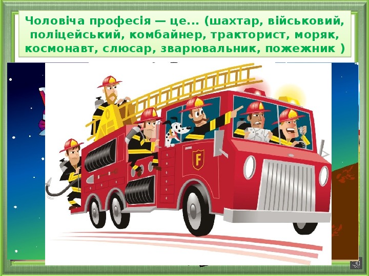 Чоловіча професія — це... (шахтар, військовий, поліцейський, комбайнер, тракторист, моряк, космонавт, слюсар, зварювальник, пожежник )