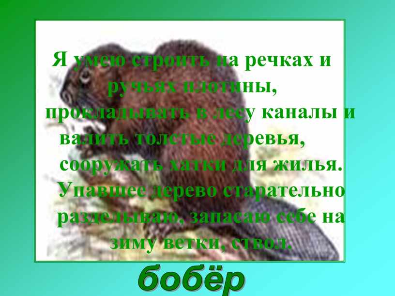Бобры всей семьёй утепляют к зиме хатки. Разделывают упавшие деревья, запасают корм – ветки ивы и осины. (Слайд)