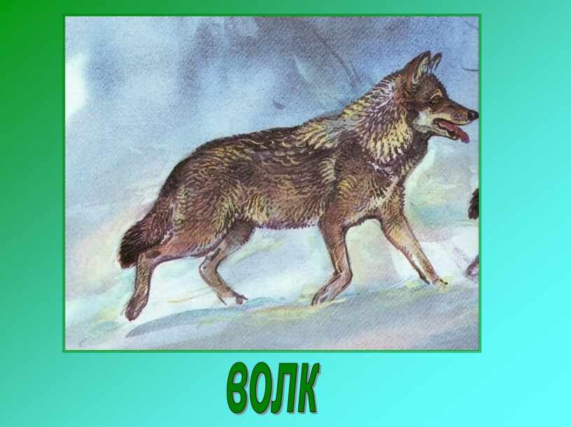 У волка шерсть к зиме становится гуще. Он хороший охотник, быстро бегает. Запасов не делает, корм найдёт себе всегда. (Слайд)