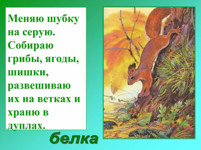 Белка меняет рыжую шубку на серую. Собирает грибы, ягоды, шишки, орехи, жёлуди. Свои запасы складывает в дуплах, развешивает на сучках. Может насушить две тысячи грибов. (Слайд)