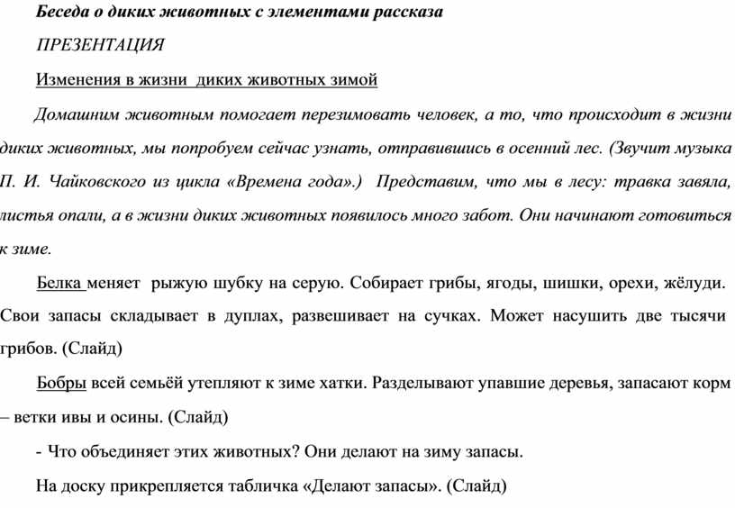 Домашним животным помогает перезимовать человек, а то, что происходит в жизни диких животных, мы попробуем сейчас узнать, отправившись в осенний лес. (Звучит музыка П. И. Чайковского из цикла «Времена года».) Представим, что мы в лесу: травка завяла, листья опали, а в жизни диких животных появилось много забот. Они начинают готовиться к зиме.