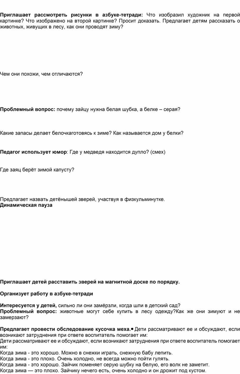 Приглашает рассмотреть рисунки в азбуке-тетради: Что изобразил художник на первой картинке? Что изображено на второй картинке? Просит доказать. Предлагает детям рассказать о животных, живущих в лесу, как они проводят зиму?