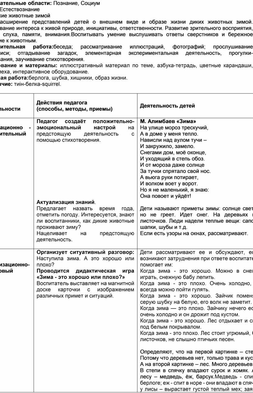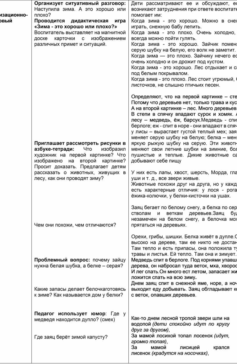 Актуализация знаний. Предлагает назвать время года, отметить погоду. Интересуется, знают ли воспитанники, как дикие животные проживают зиму? Нацеливает на предстоящую деятельность.