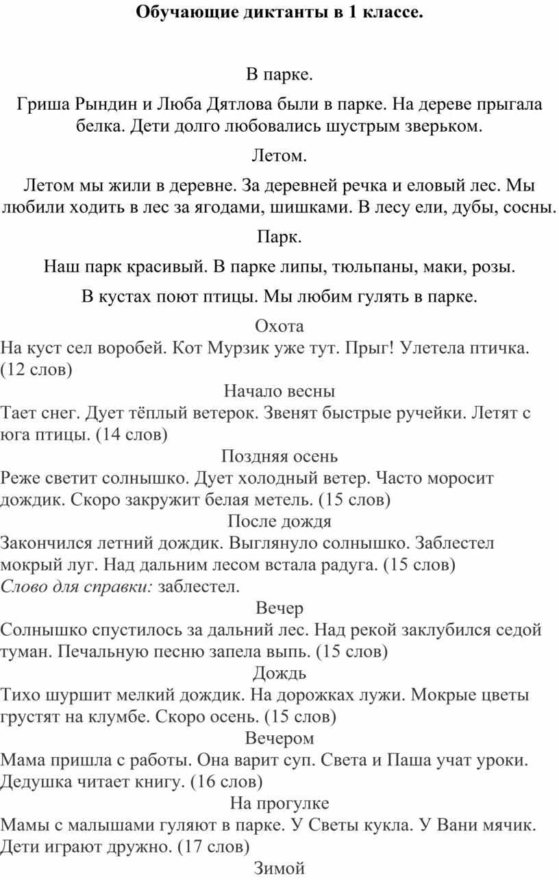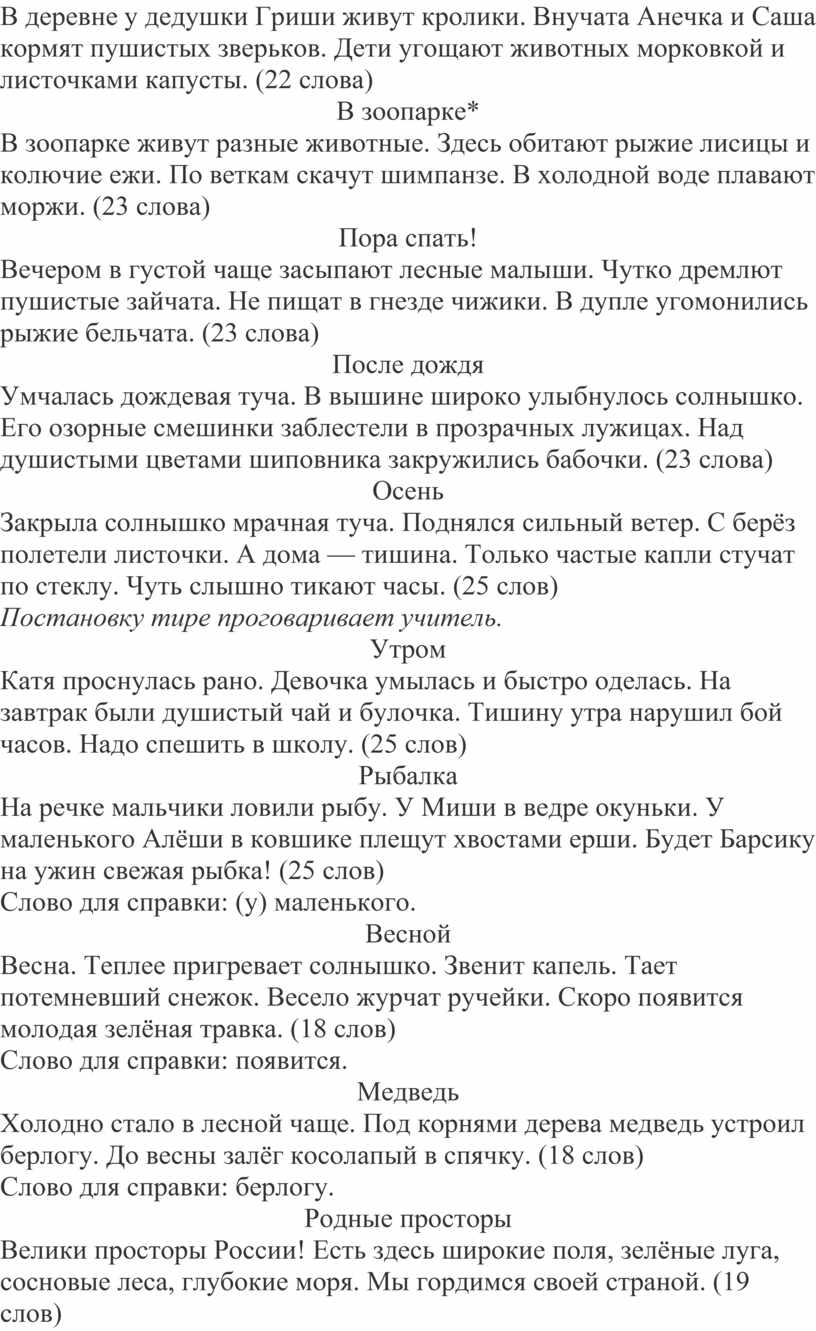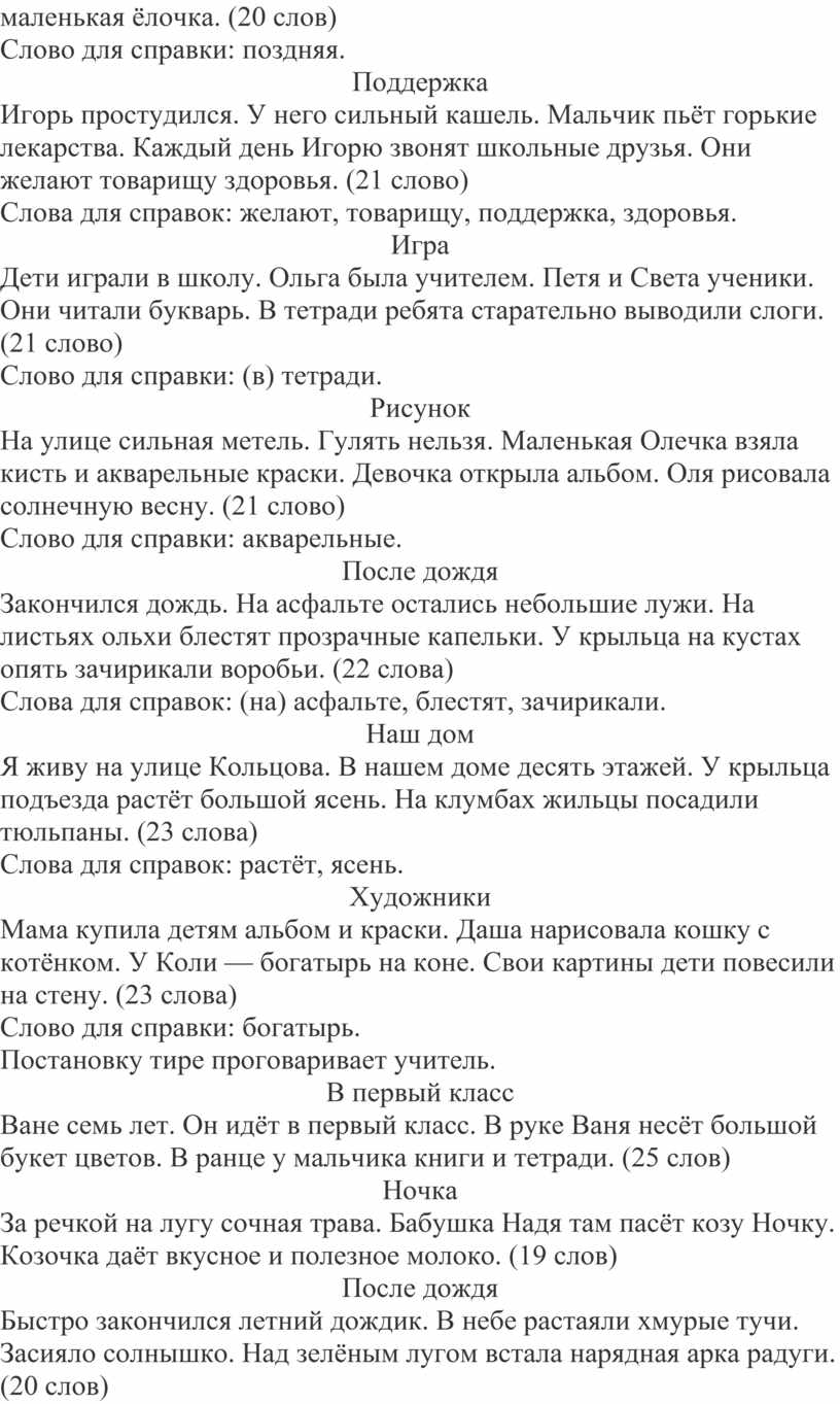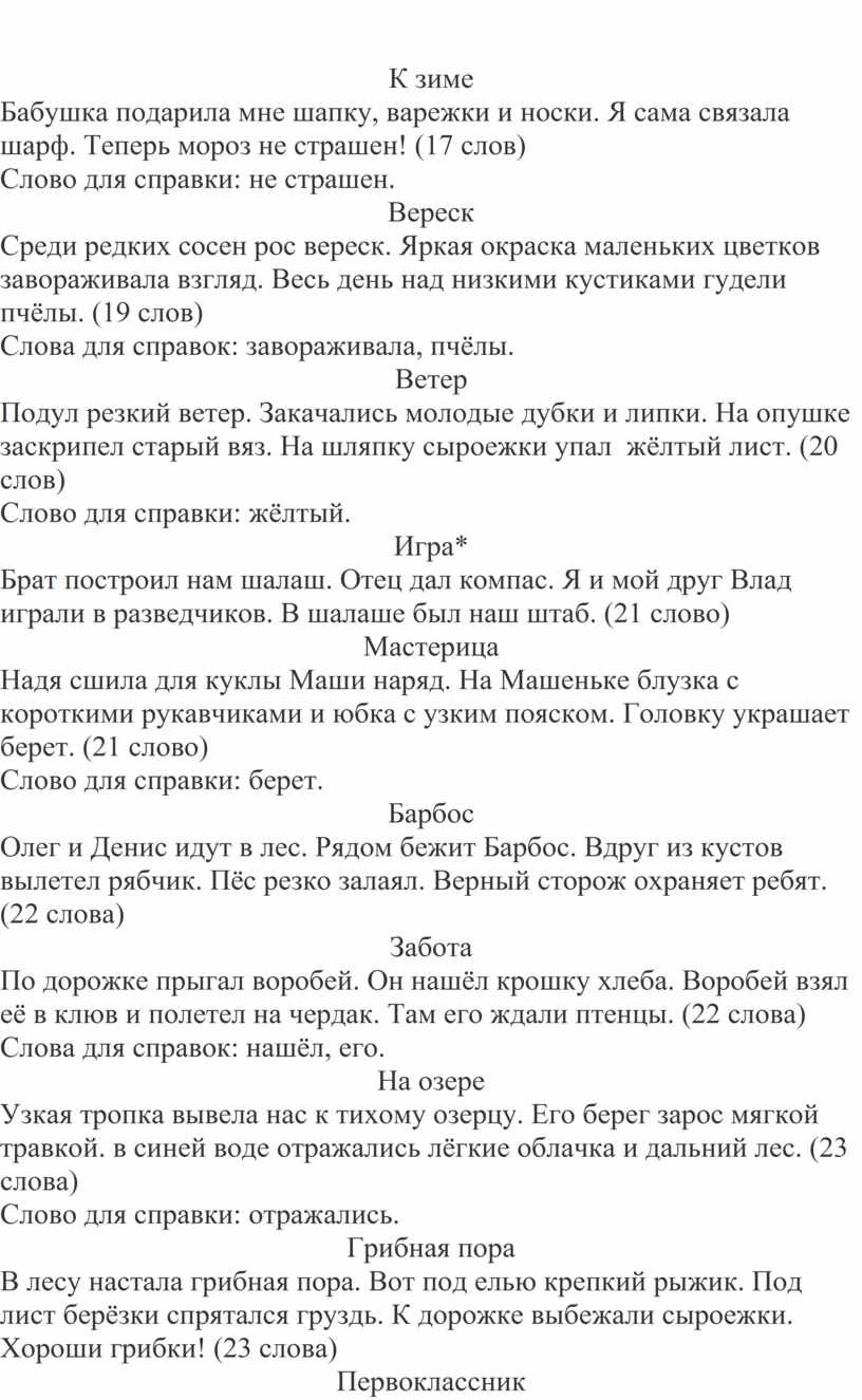 В лесу настала грибная пора. Вот под елью крепкий рыжик. Под лист берёзки спрятался груздь. К дорожке выбежали сыроежки. Хороши грибки! (23 слова)