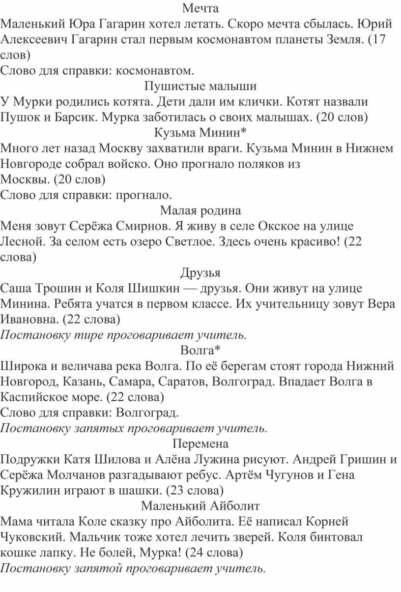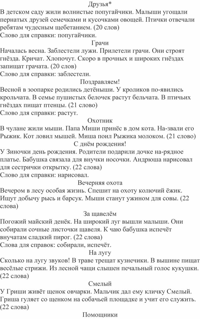 У Мурки родились котята. Дети дали им клички. Котят назвали Пушок и Барсик. Мурка заботилась о своих малышах. (20 слов)
