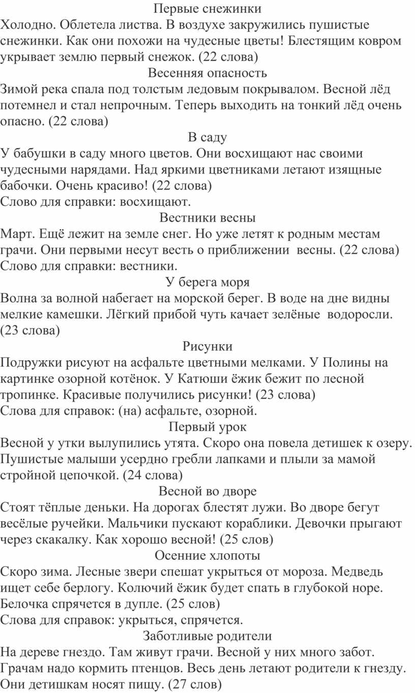 Тает снег. Дует тёплый ветерок. Звенят быстрые ручейки. Летят с юга птицы. (14 слов)