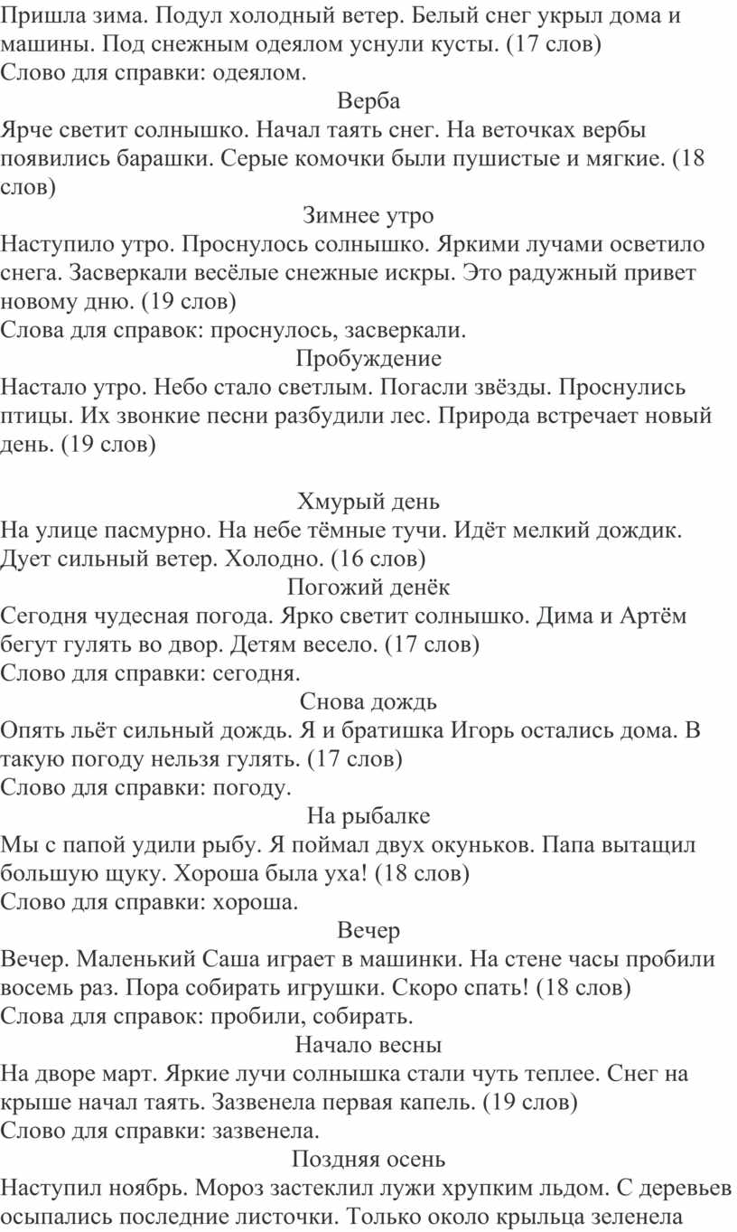 Реже светит солнышко. Дует холодный ветер. Часто моросит дождик. Скоро закружит белая метель. (15 слов)