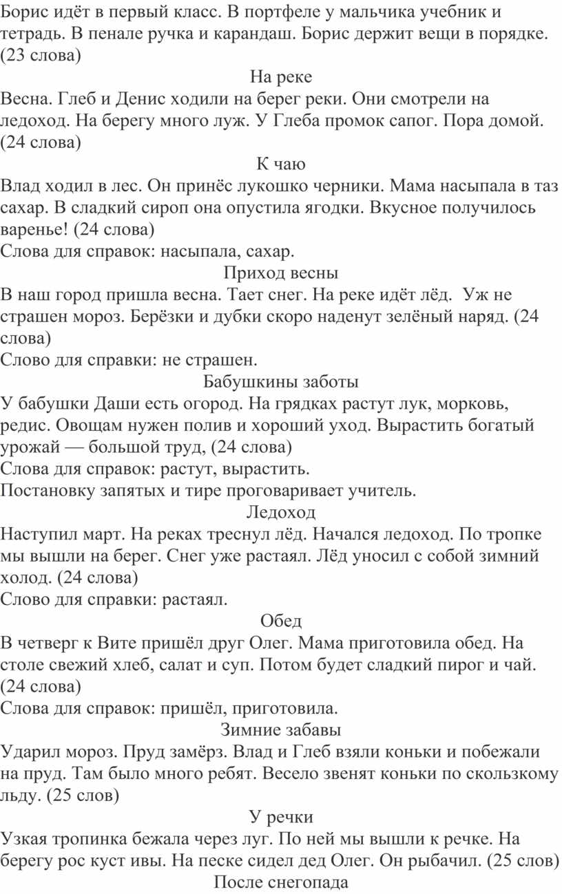 Весна. Глеб и Денис ходили на берег реки. Они смотрели на ледоход. На берегу много луж. У Глеба промок сапог. Пора домой. (24 слова)