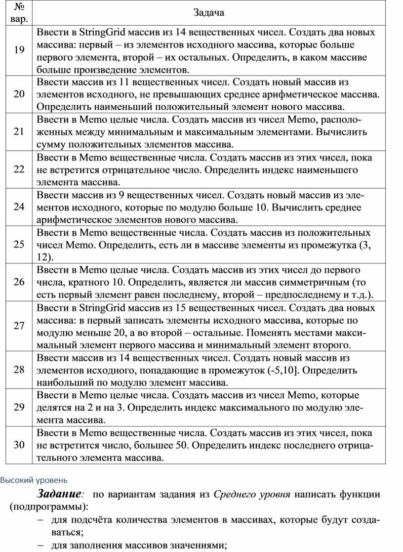 Задание: по вариантам задания из Среднего уровня написать функции (подпрограммы):