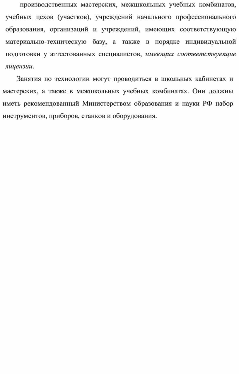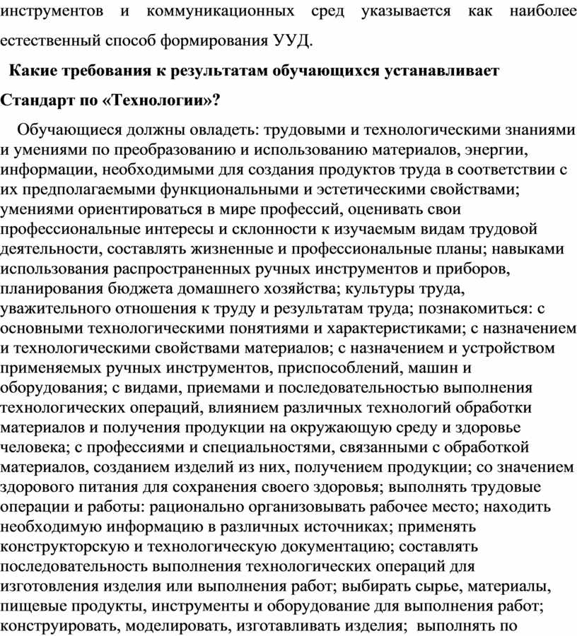 Обучающиеся должны овладеть: трудовыми и технологическими знаниями и умениями по преобразованию и использованию материалов, энергии, информации, необходимыми для создания продуктов труда в соответствии с их предполагаемыми функциональными и эстетическими свойствами; умениями ориентироваться в мире профессий, оценивать свои профессиональные интересы и склонности к изучаемым видам трудовой деятельности, составлять жизненные и профессиональные планы; навыками использования распространенных ручных инструментов и приборов, планирования бюджета домашнего хозяйства; культуры труда, уважительного отношения к труду и результатам труда; познакомиться: с основными технологическими понятиями и характеристиками; с назначением и технологическими свойствами материалов; с назначением и устройством применяемых ручных инструментов, приспособлений, машин и оборудования; с видами, приемами и последовательностью выполнения технологических операций, влиянием различных технологий обработки материалов и получения продукции на окружающую среду и здоровье человека; с профессиями и специальностями, связанными с обработкой материалов, созданием изделий из них, получением продукции; со значением здорового питания для сохранения своего здоровья; выполнять трудовые операции и работы: рационально организовывать рабочее место; находить необходимую информацию в различных источниках; применять конструкторскую и технологическую документацию; составлять последовательность выполнения технологических операций для изготовления изделия или выполнения работ; выбирать сырье, материалы, пищевые продукты, инструменты и оборудование для выполнения работ; конструировать, моделировать, изготавливать изделия; выполнять по заданным критериям технологические операции с использованием ручных инструментов, приспособлений, машин, оборудования, электроприборов; соблюдать безопасные приемы труда и правила пользования ручными инструментами, машинами и электрооборудованием; осуществлять доступными мерительными средствами, измерительными приборами и визуально контроль качества изготавливаемого изделия (детали); находить и устранять допущенные дефекты; проводить разработку творческого проекта изготовления изделия или получения продукта с использованием освоенных технологий и доступных материалов; планировать работы с учетом имеющихся ресурсов и условий; распределять работу при коллективной деятельности.