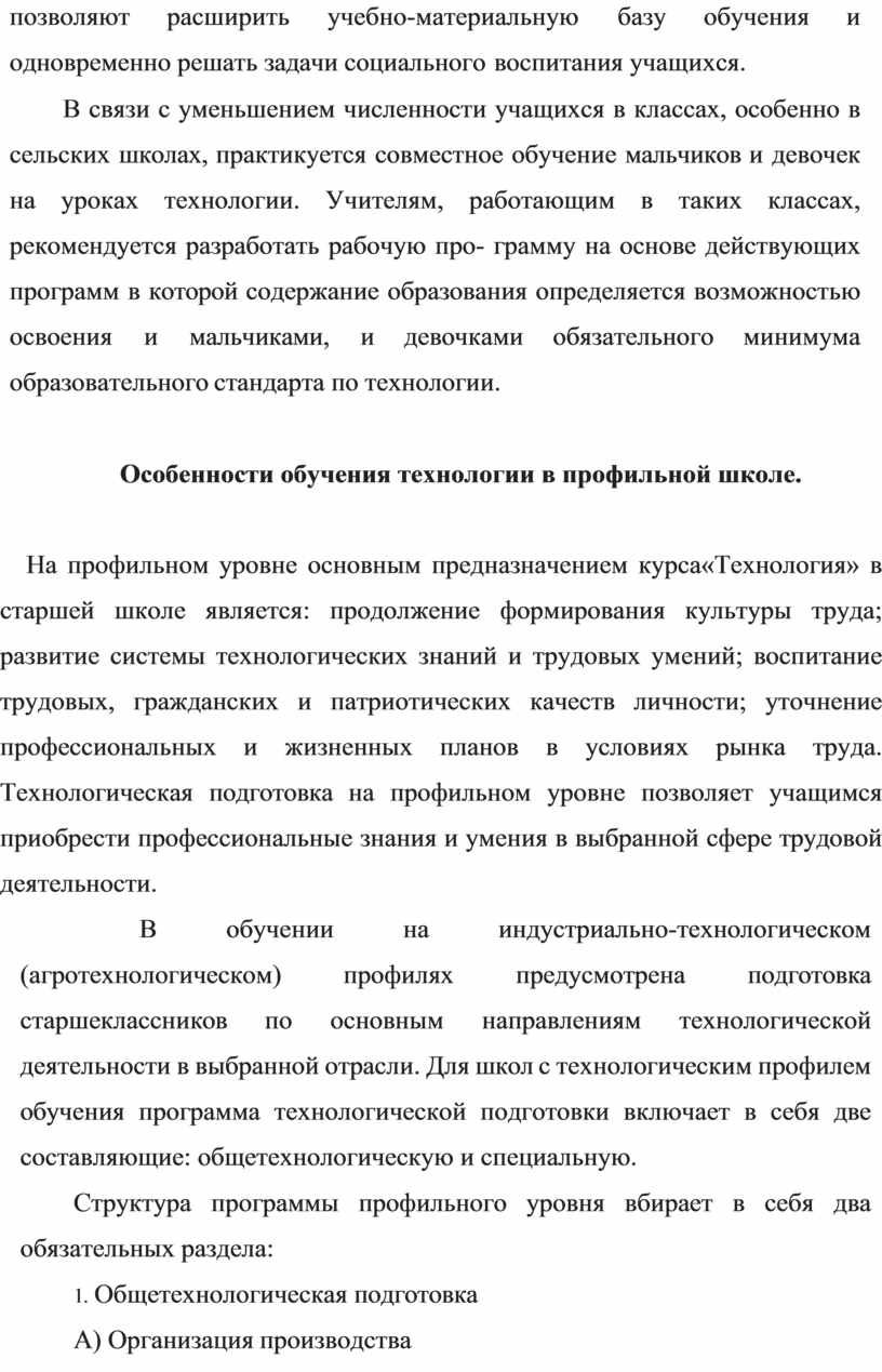 Основным предназначением образовательной области «Технология» в системе общего образования является формирование технологического мировоззрения и технологической культуры, воспитание трудовых, гражданских и патриотических качеств школьника, профессиональное самоопределение в условиях рынка труда, формирование гуманистически ориентированного мировоззрения. В рамках "Технологии" происходит знакомство с миром профессий, осуществляется профориентация школьников на работу в различных сферах общественного производства. Тем самым немаловажной особенностью курса является обеспечение преемственности перехода от общего к профессиональному образованию и трудовой деятельности. В связи с этим необходимо менять технологию работы учителя, так как требования новых стандартов состоят в переходе от традиционных технологий к технологиям развивающего обучения, которые носят личностно - ориентированнный характер, вариативны, повышают ответственность школьников за результаты обучения.