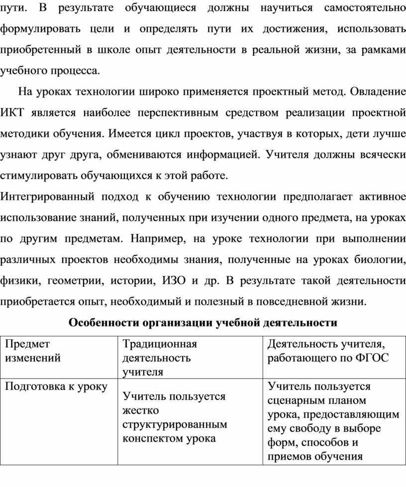 Интегрированный подход к обучению технологии предполагает активное использование знаний, полученных при изучении одного предмета, на уроках по другим предметам. Например, на уроке технологии при выполнении различных проектов необходимы знания, полученные на уроках биологии, физики, геометрии, истории, ИЗО и др. В результате такой деятельности приобретается опыт, необходимый и полезный в повседневной жизни.