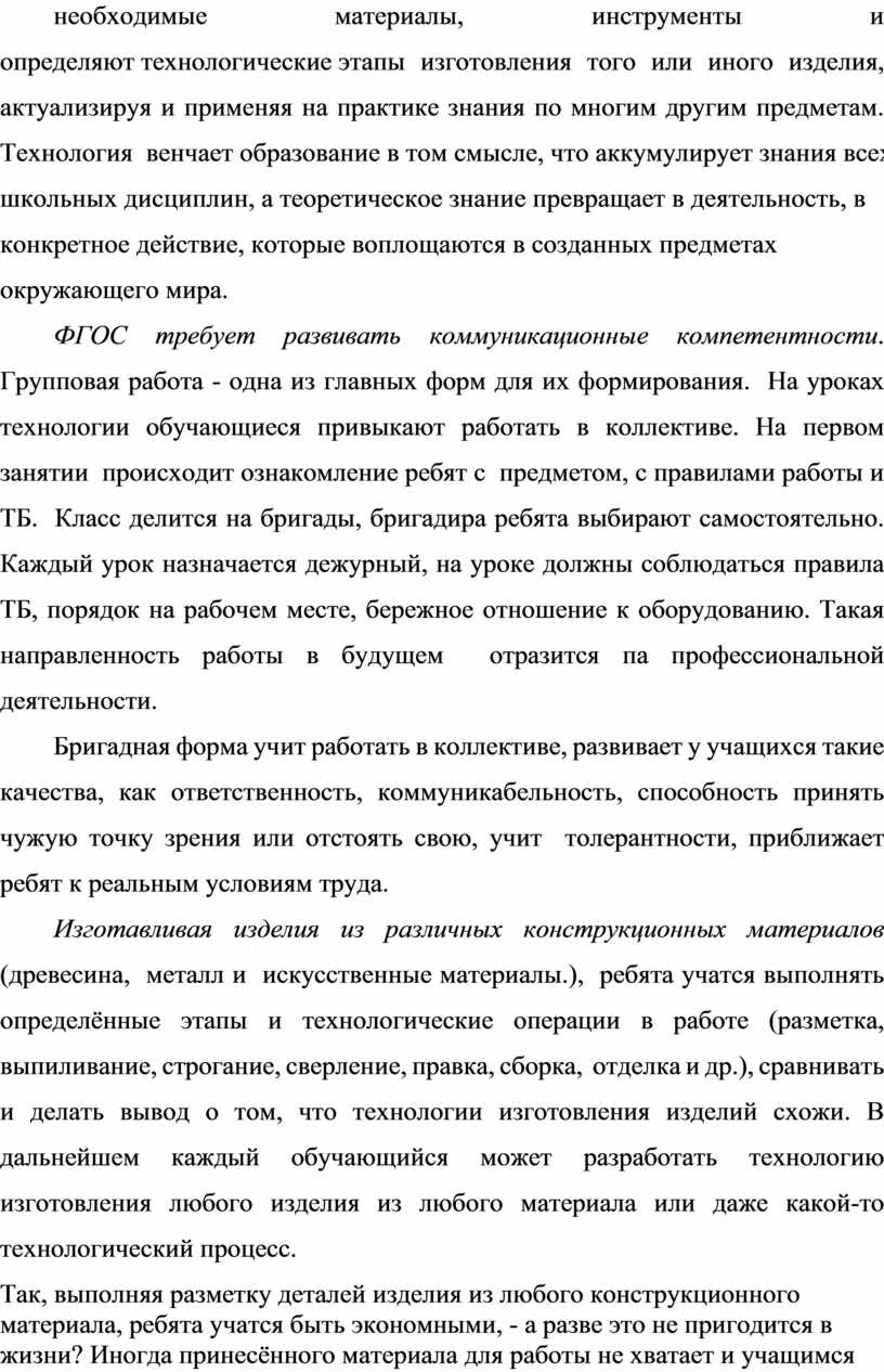 Именно на уроках технологии учащиеся выдвигают и обосновывают идеи, моделируют, конструируют, выполняют экономические расчеты, подбирают необходимые материалы, инструменты и определяют технологические этапы изготовления того или иного изделия, актуализируя и применяя на практике знания по многим другим предметам.