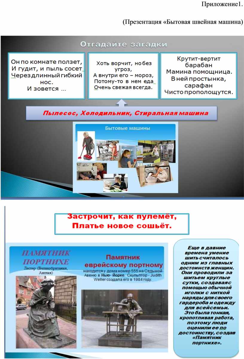 Учащимся предлагается угадать загадки (сл.1). Проведение беседы: 1.Что объединяет эти загадки? (в них говорится о бытовых швейных машинах). 2. Для чего они предназначены? (они помогают при проведении домашних работ) Предлагается еще одна загадка. 3. О какой машине идет речь? (о швейной машине). Рассказ о профессии портной (сл.2) |