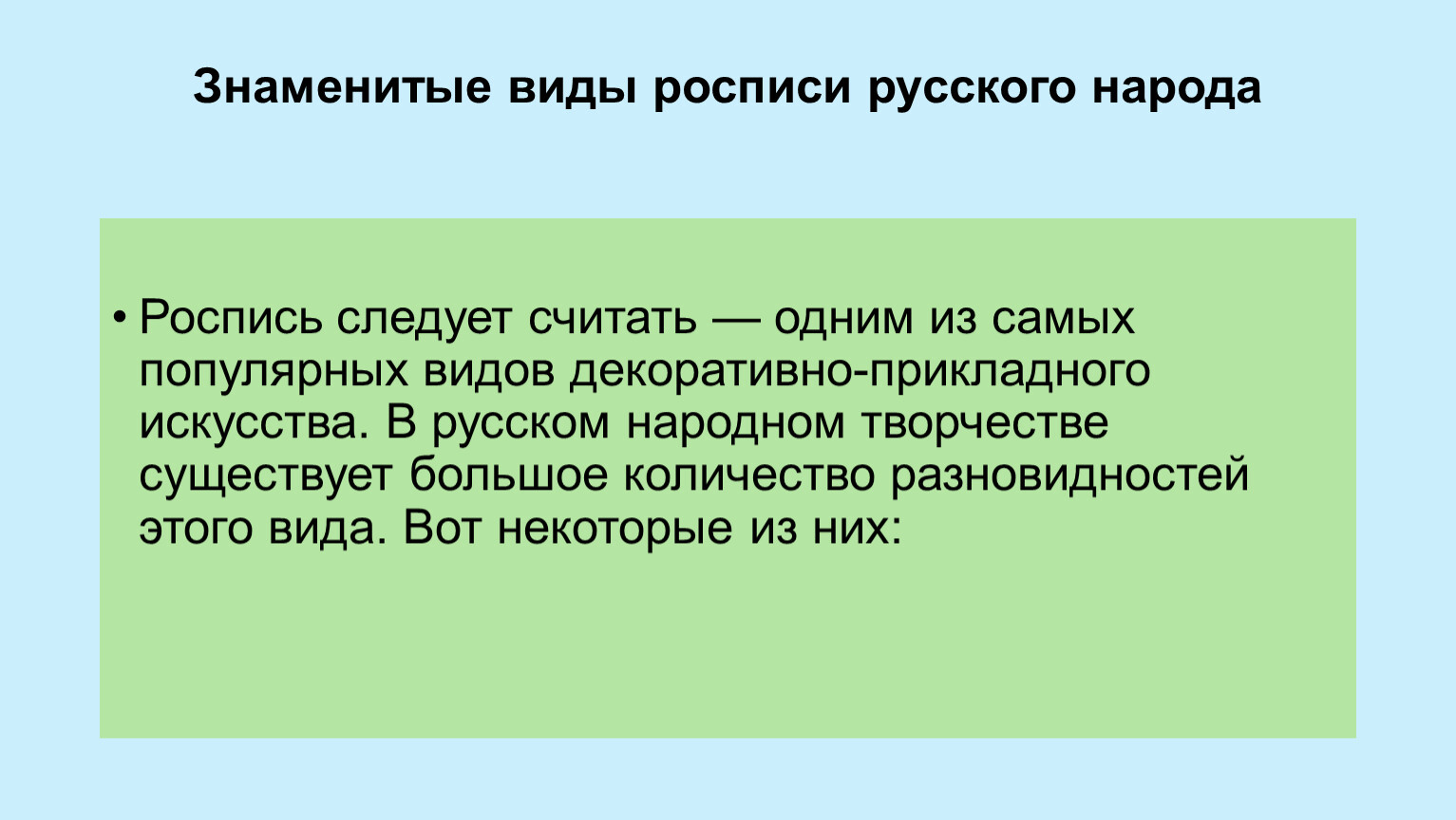 Роспись следует считать — одним из самых популярных видов декоративно-прикладного искусства. В русском народном творчестве существует большое количество разновидностей этого вида. Вот некоторые из них: