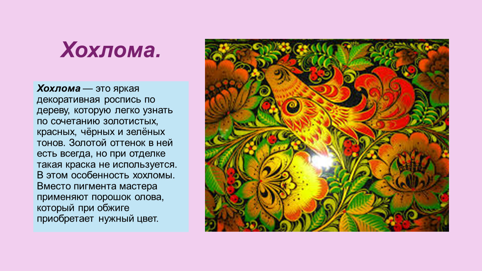 Хохлома — это яркая декоративная роспись по дереву, которую легко узнать по сочетанию золотистых, красных, чёрных и зелёных тонов. Золотой оттенок в ней есть всегда, но при отделке такая краска не используется. В этом особенность хохломы. Вместо пигмента мастера применяют порошок олова, который при обжиге приобретает нужный цвет.