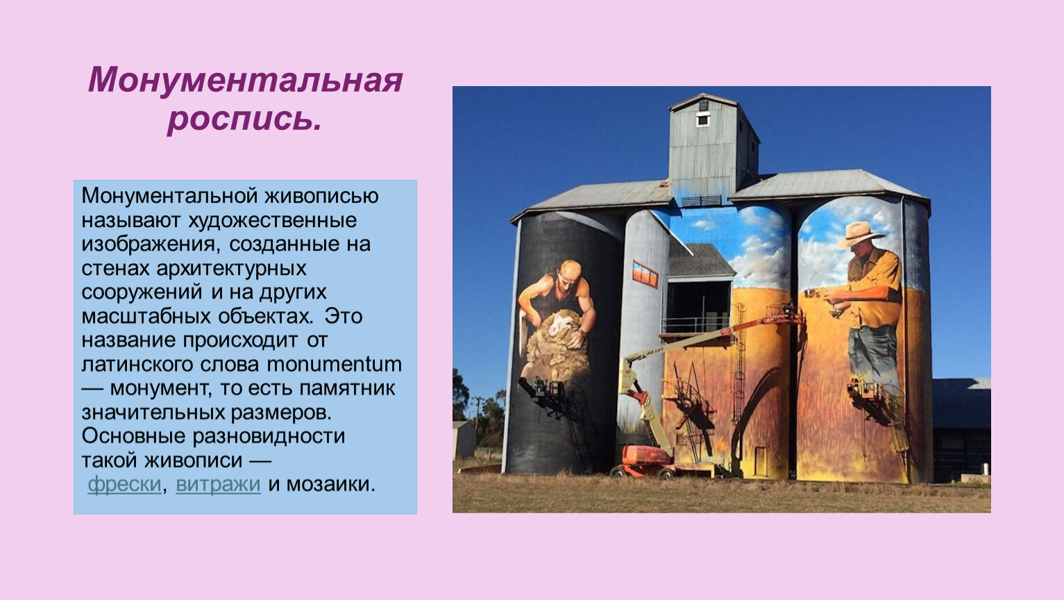 Монументальной живописью называют художественные изображения, созданные на стенах архитектурных сооружений и на других масштабных объектах. Это название происходит от латинского слова monumentum — монумент, то есть памятник значительных размеров. Основные разновидности такой живописи — фрески, витражи и мозаики.