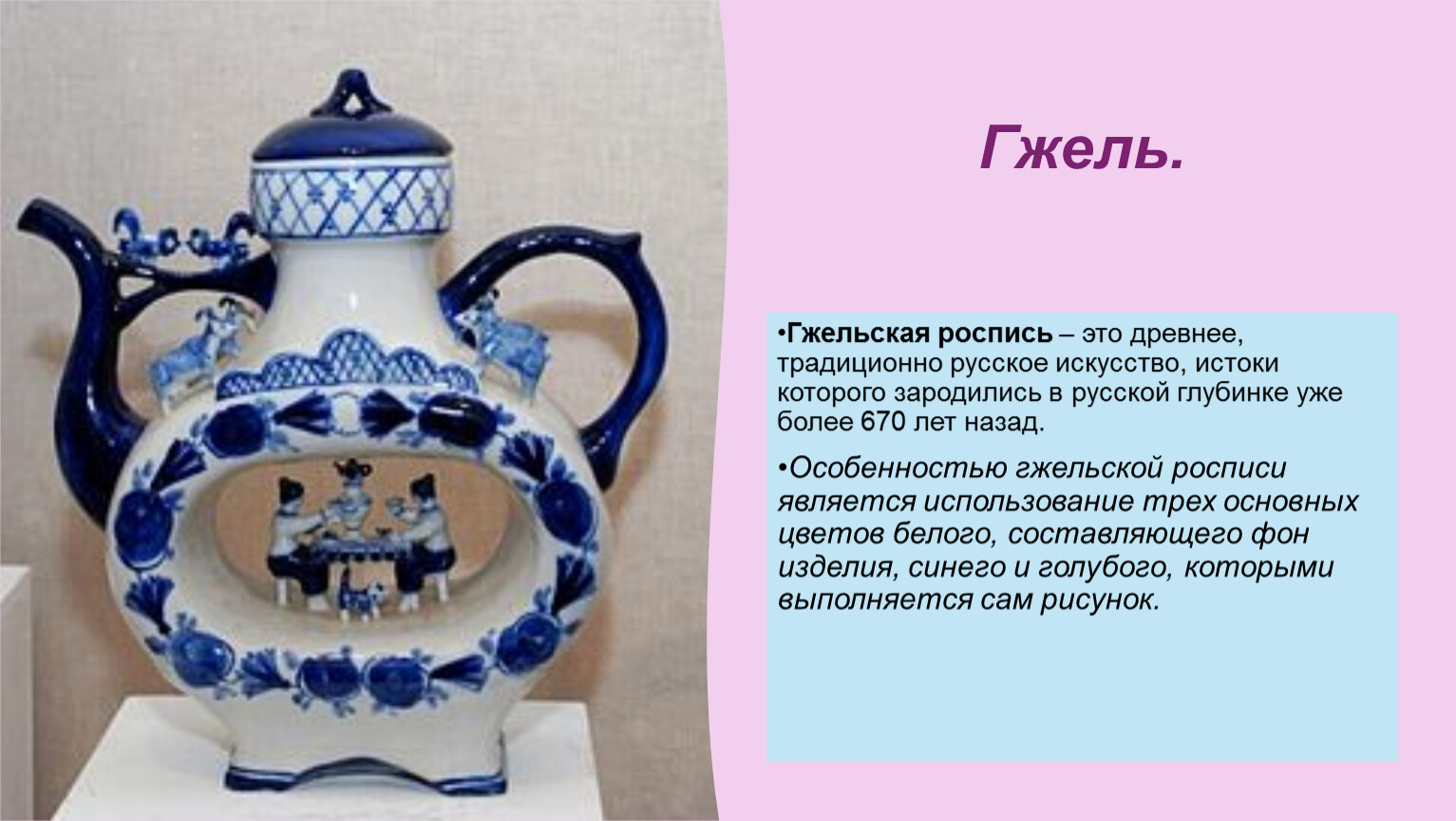 Гжельская роспись – это древнее, традиционно русское искусство, истоки которого зародились в русской глубинке уже более 670 лет назад.