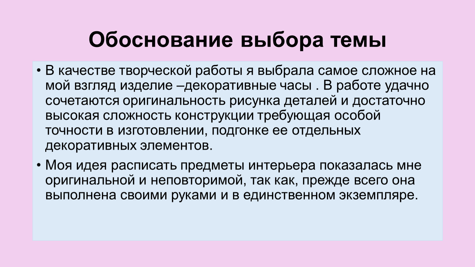 В качестве творческой работы я выбрала самое сложное на мой взгляд изделие –декоративные часы . В работе удачно сочетаются оригинальность рисунка деталей и достаточно высокая сложность конструкции требующая особой точности в изготовлении, подгонке ее отдельных декоративных элементов.