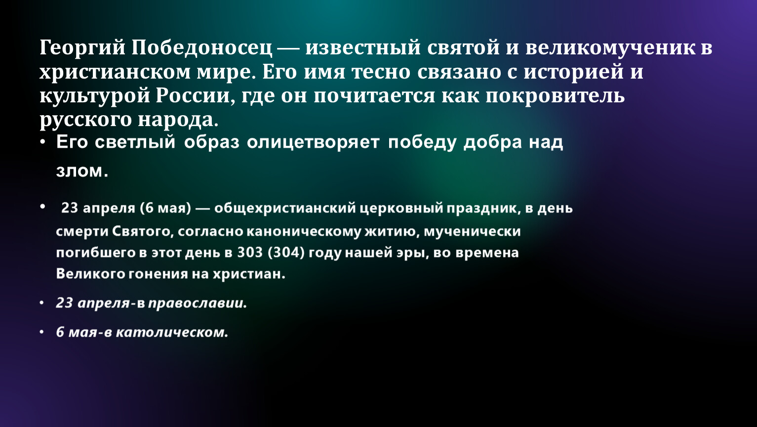 23 апреля (6 мая) — общехристианский церковный праздник, в день смерти Святого, согласно каноническому житию, мученически погибшего в этот день в 303 (304) году нашей эры, во времена Великого гонения на христиан.