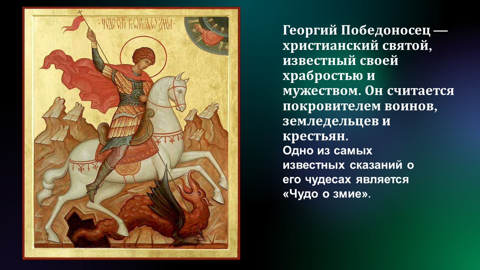 Георгий Победоносец — христианский святой, известный своей храбростью и мужеством. Он считается покровителем воинов, земледельцев и крестьян.