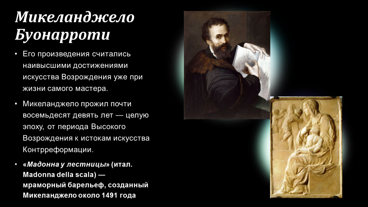 Микеланджело прожил почти восемьдесят девять лет — целую эпоху, от периода Высокого Возрождения к истокам искусства Контрреформации.