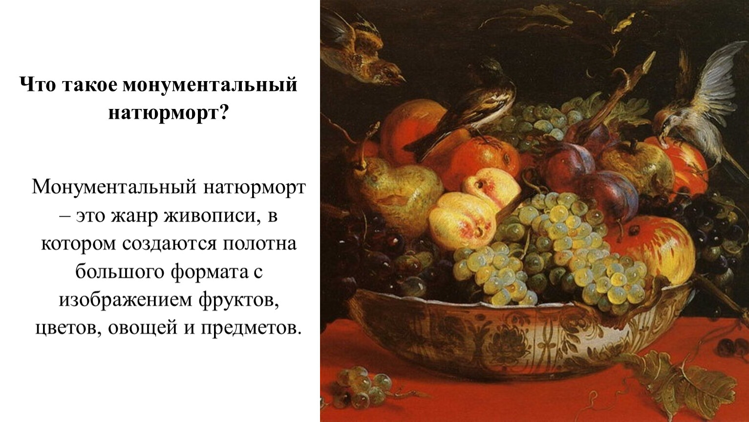 Что такое монументальный натюрморт?Монументальный натюрморт – это жанр живописи, в котором создаются полотна большого формата с изображением фруктов, цветов, овощей и предметов.