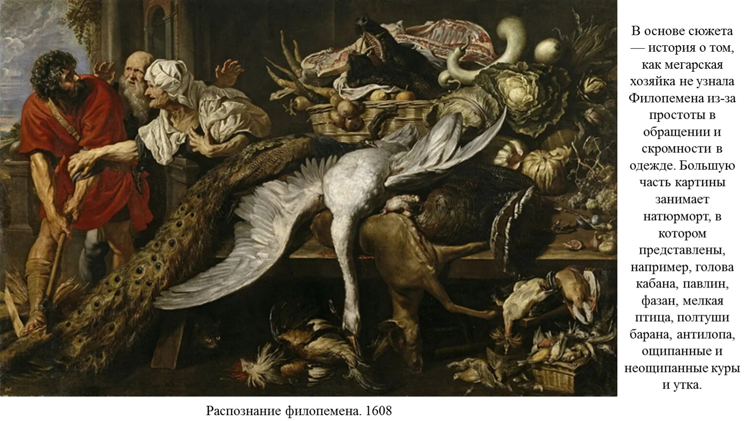 В основе сюжета — история о том, как мегарская хозяйка не узнала Филопемена из-за простоты в обращении и скромности в одежде. Большую часть картины занимает натюрморт, в котором представлены, например, голова кабана, павлин, фазан, мелкая птица, полтуши барана, антилопа, ощипанные и неощипанные куры и утка.