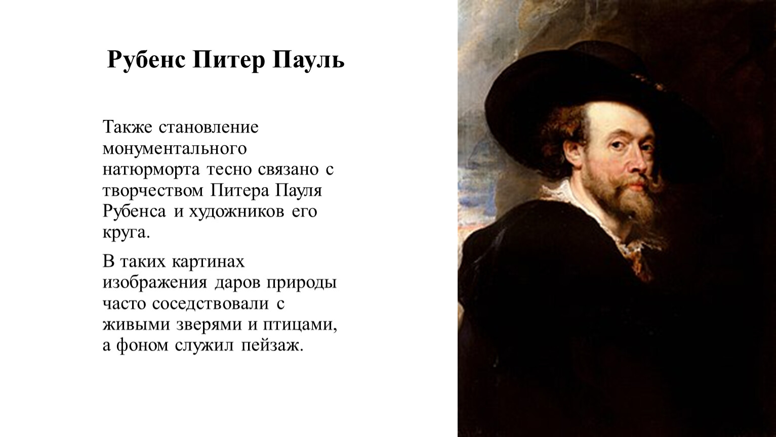 Также становление монументального натюрморта тесно связано с творчеством Питера Пауля Рубенса и художников его круга.