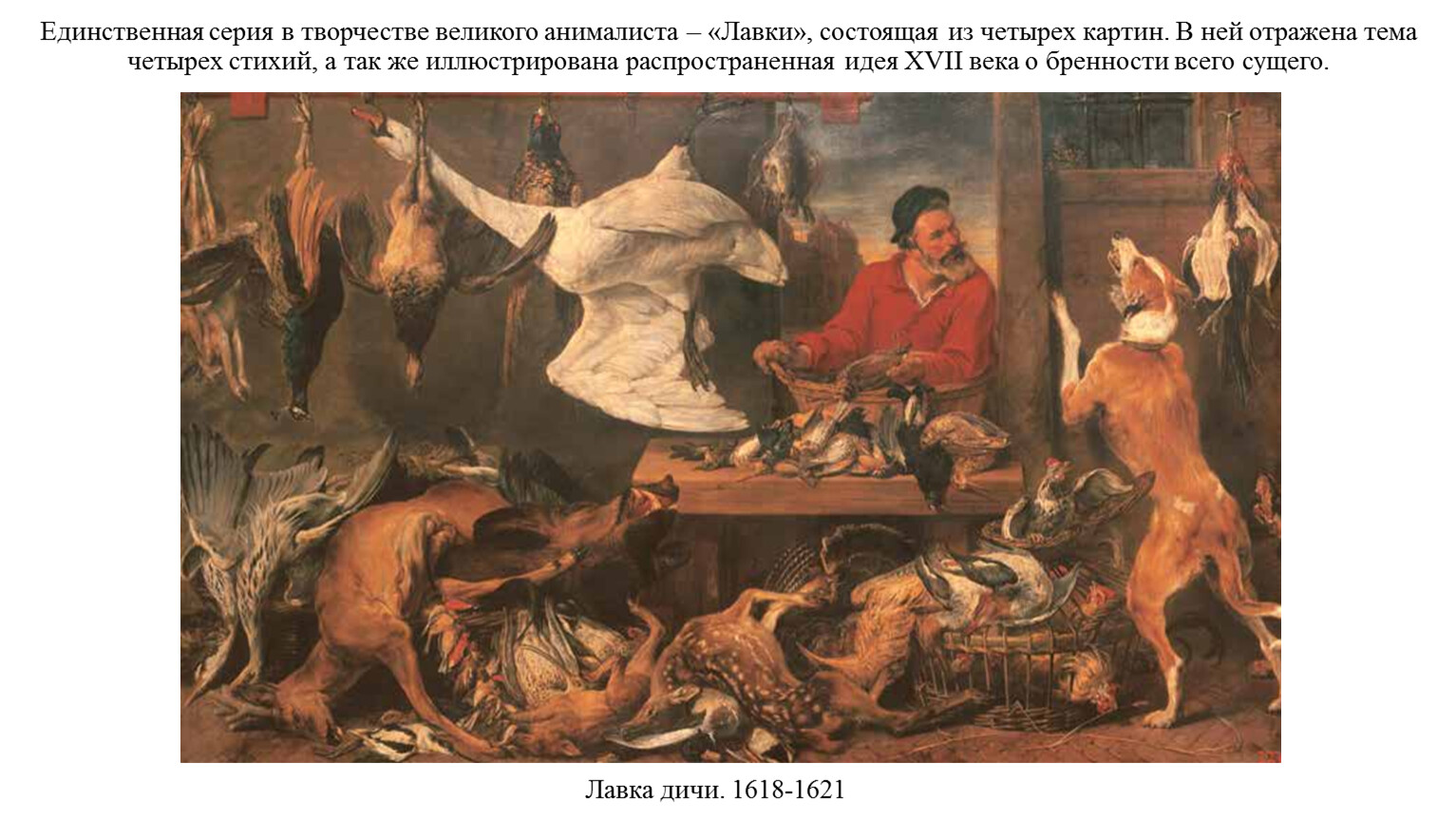 Единственная серия в творчестве великого анималиста – «Лавки», состоящая из четырех картин. В ней отражена тема четырех стихий, а так же иллюстрирована распространенная идея XVII века о бренности всего сущего.