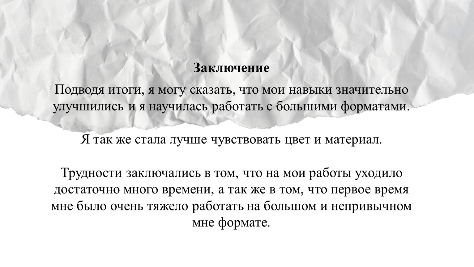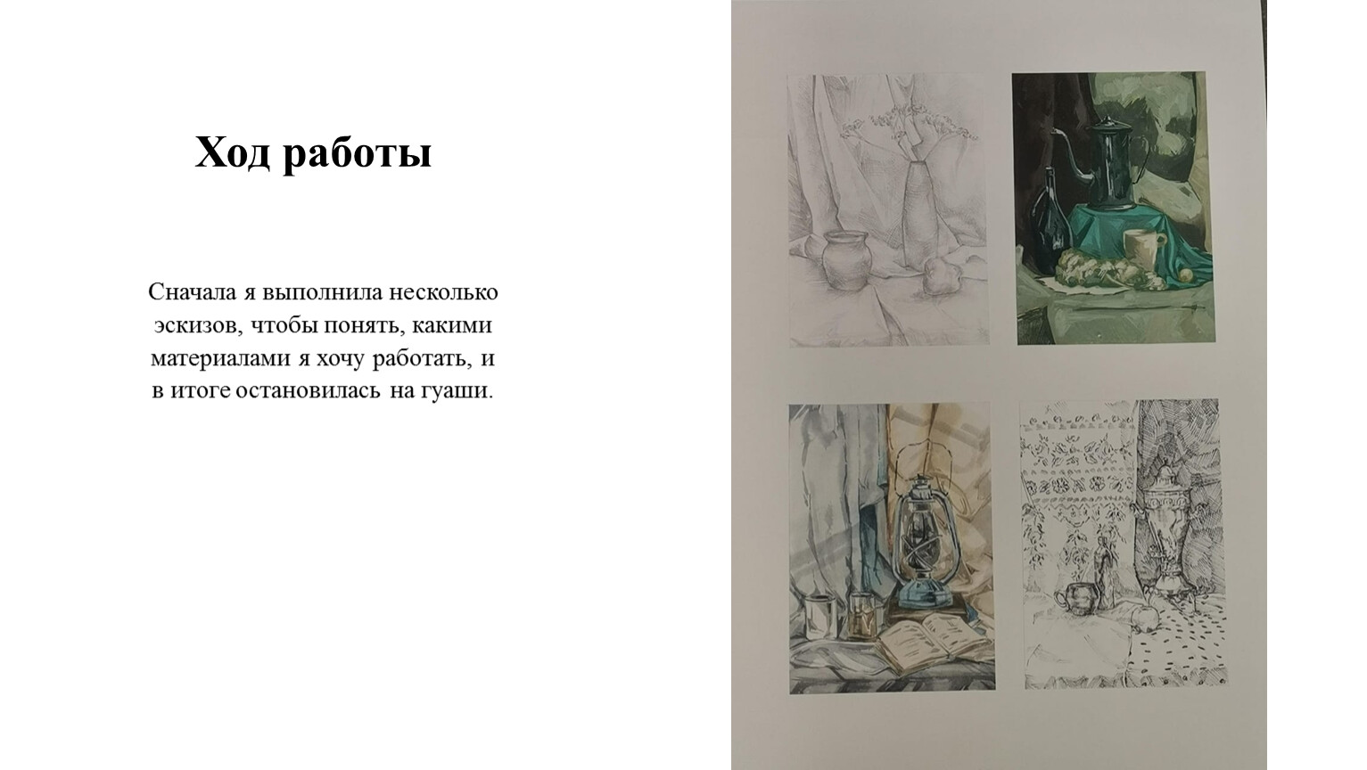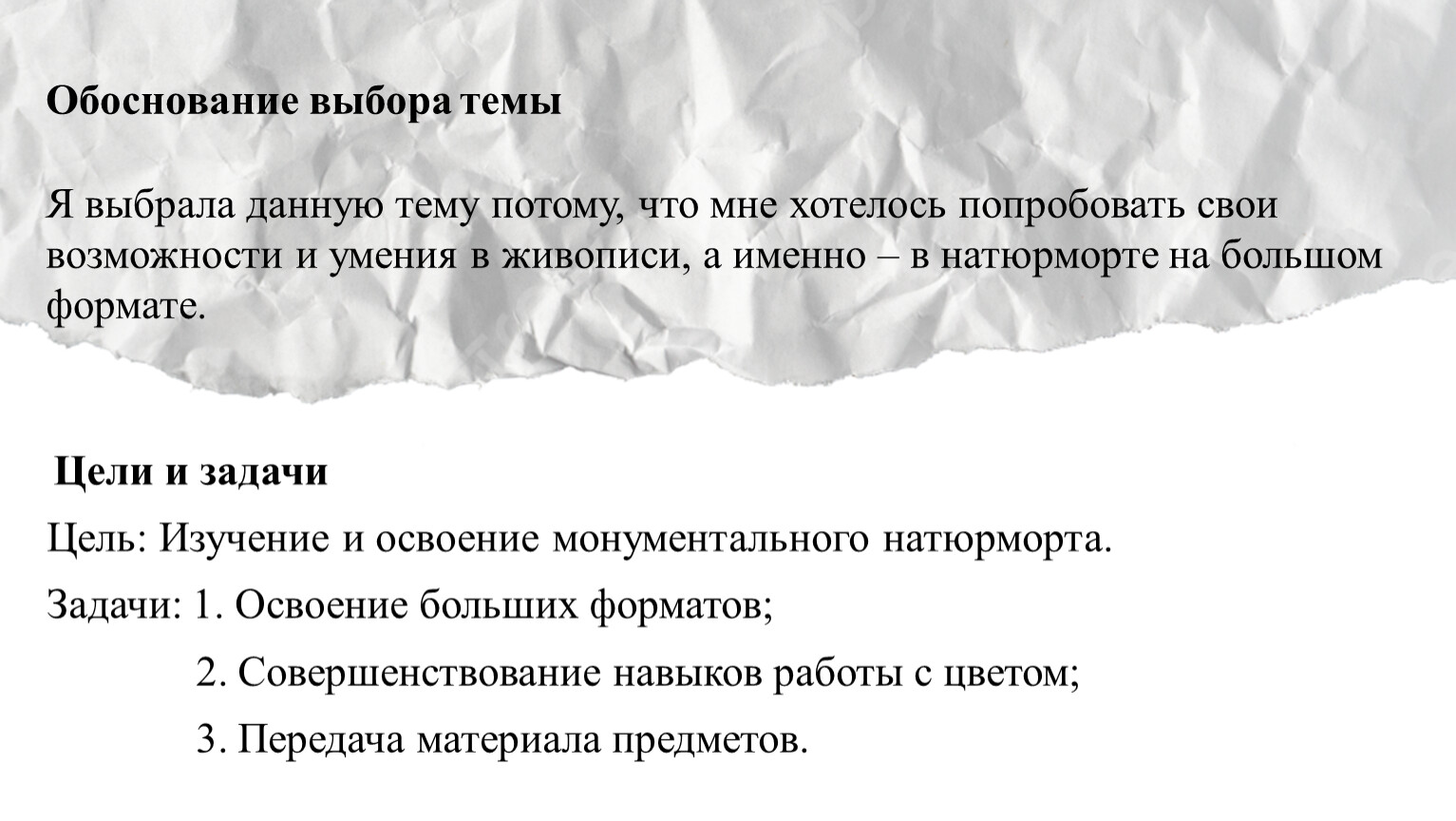 Я выбрала данную тему потому, что мне хотелось попробовать свои возможности и умения в живописи, а именно – в натюрморте на большом формате.
