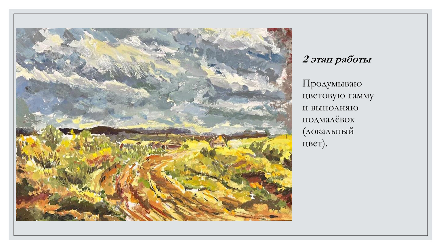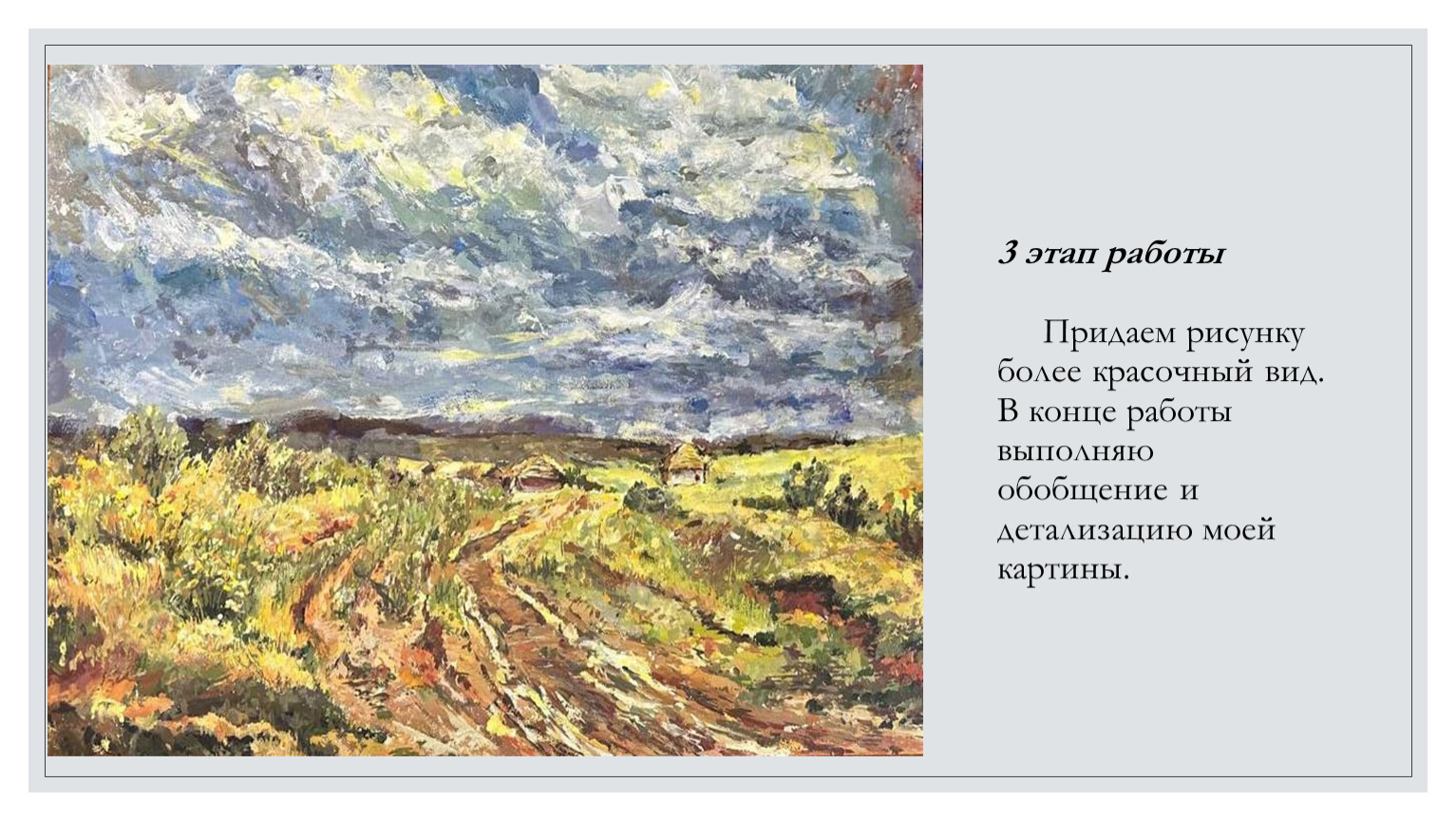 3 этап работы Придаем рисунку более красочный вид. В конце работы выполняю обобщение и детализацию моей картины.